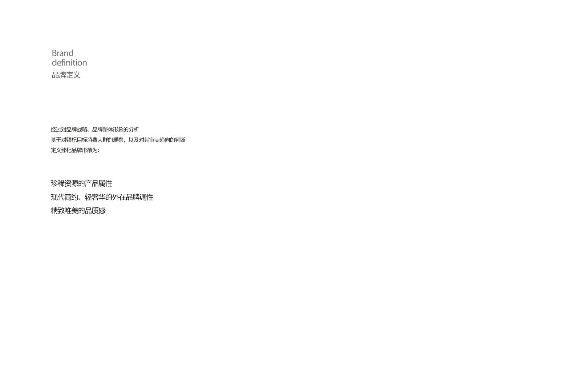 智圓行方團隊經過對品牌戰(zhàn)略、品牌整體形象分析,基于對臻杞目標人群的觀察,以及對其審美趨向的判斷,定義臻杞品牌形象為:珍稀資源的產品屬性現(xiàn)代簡約、輕奢的外在品牌調性精致唯美的品質感。